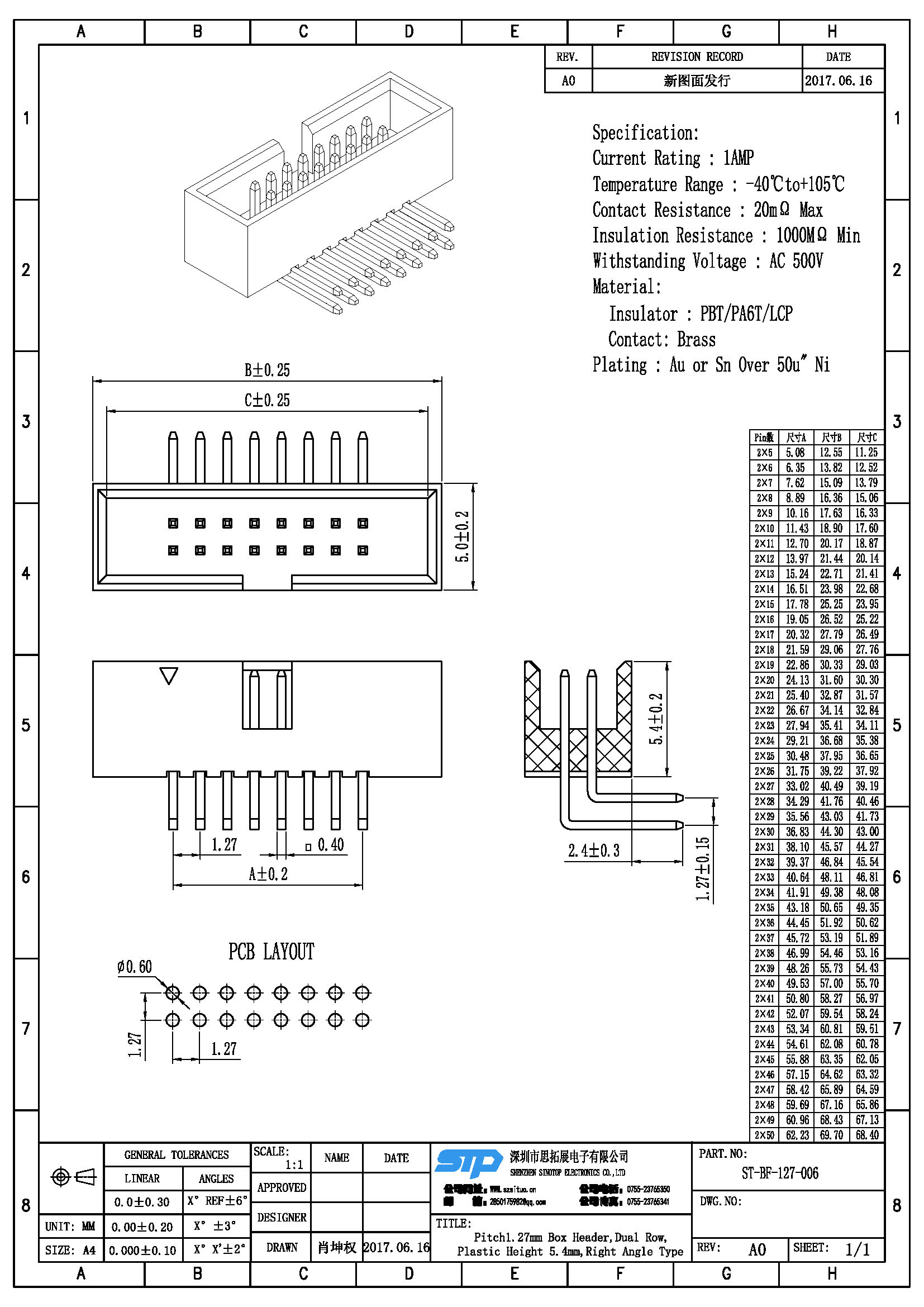 间距:PITCH1.27MM简易牛角,双排,90°, H5.4MM