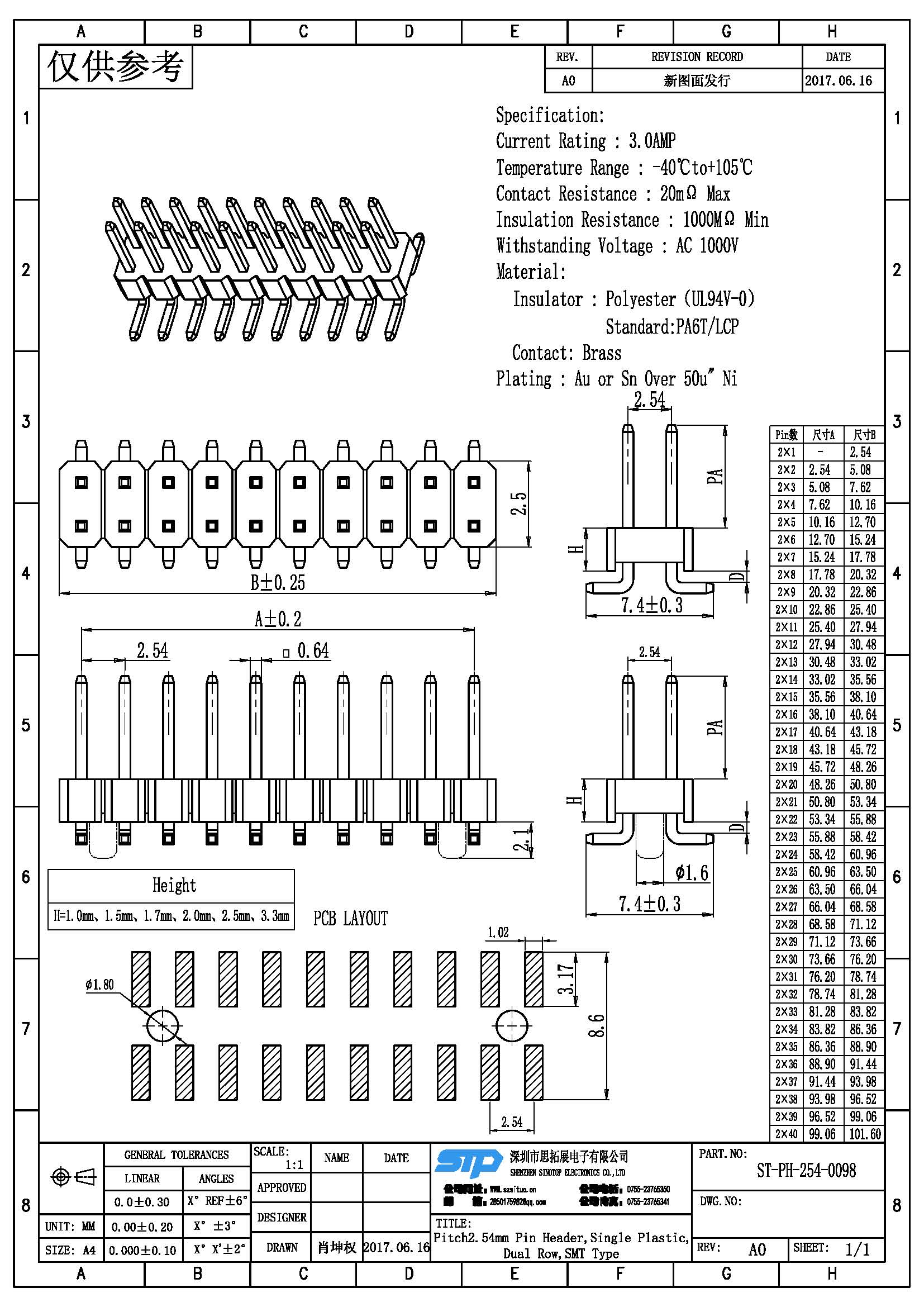 规格型号:Pitch2.54MM,双排针,单塑,贴片
