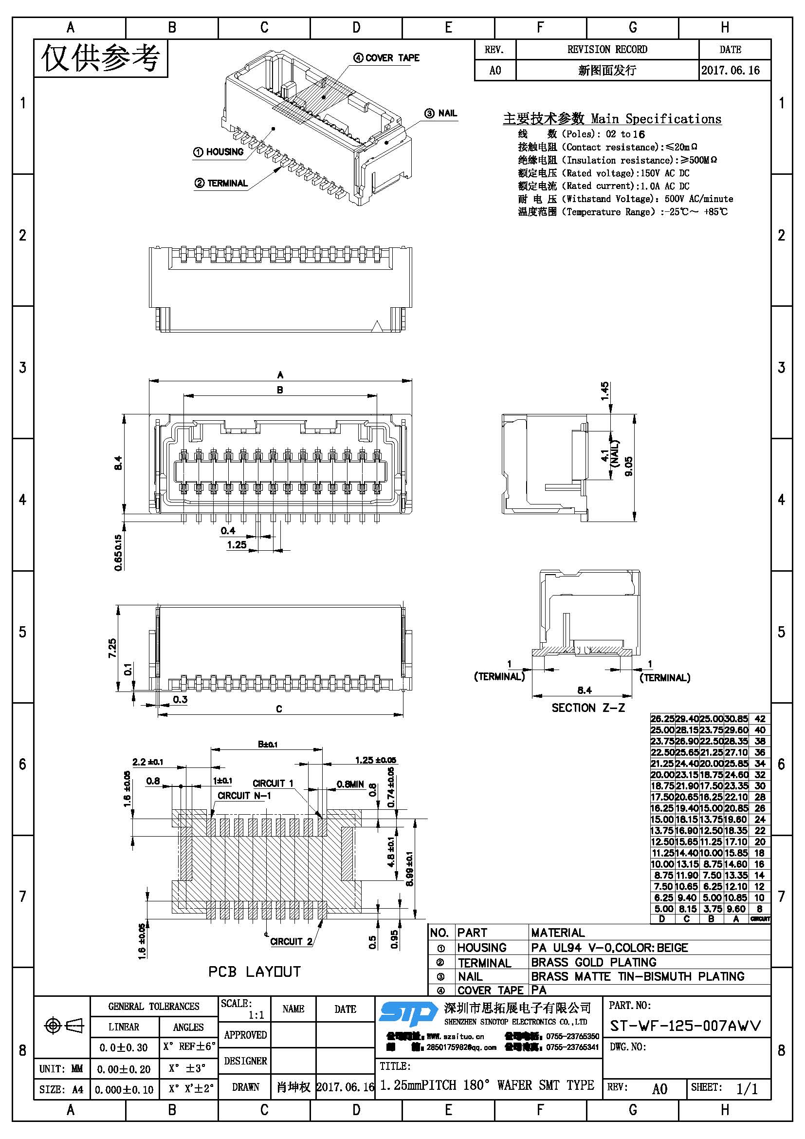 规格型号:1.25MM间距 180度 SMT WAFER